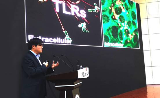 邵峰院士的报告从病原菌感染宿主后诱发的固有免疫展开,分三个部分介绍了其实验团队近年来的研究成果。第一部分内容中,邵峰院士团队首次鉴定了固有免疫细胞用于识别胞内病原菌的模式识别受体(NAIPS, Pyrin及Caspase 4/5/11),并证明这些受体均可诱发细胞程序性坏死——细胞焦亡(Pyroptosis)。后续研究中,课题组通过全基因组筛选发现了细胞焦亡的下游蛋白——Gasdermin D(GSDMD);并揭示了GSDMD通过被Caspase 1/11剪切获得打孔活性后在细胞膜上形成孔道,以诱发细胞焦亡的机制。第二部分内容中,邵峰院士介绍了Gasdermin家族的另一个成员Gasdermin E(GSDME)在肿瘤免疫中的作用。他们首先证明了GSDME可被Caspase 3切割并诱发细胞焦亡。后续研究中,他们发现大多癌细胞则可通过甲基化抑制GSDME的表达以抑制焦亡。通过用地西他滨抑制甲基化后,他们发现癌细胞对化疗药物更加敏感,并进一步证明该过程是焦亡诱发的适应性免疫清除。第三部分工作中,邵峰院士介绍了其团队在抗病原菌固有免疫的最新成果。他们首次发现并证明哺乳动物细胞内的一个新激酶ALPK1可以特异性识别细菌脂多糖LPS的前体分子ADP-heptose(二磷酸腺苷庚糖),进而激活NF-κB通路介导天然免疫炎症反应。