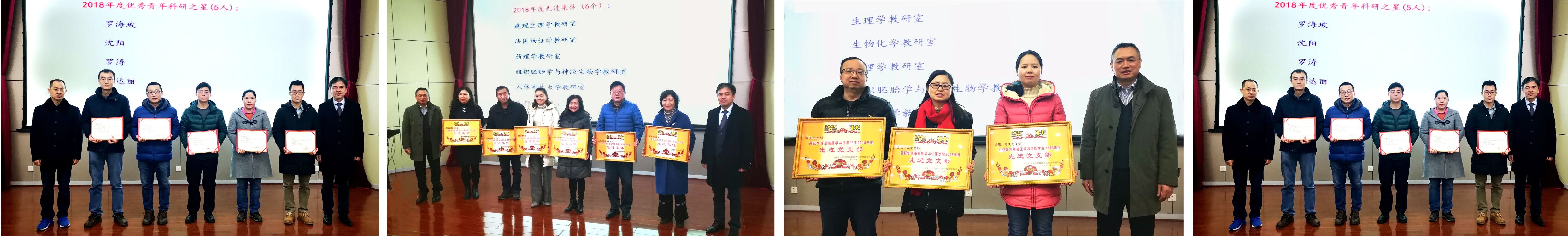 学院教授委员会刘肖珩主席宣布2018年学校和学院先进集体和个人。他表示,2018年在学院党委、行政的领导下,学院在教学、科研、人才培养等各个方面取得了显著成绩,为激励先进、树立榜样、振奋精神,学院评选病理生理学教研室等6个教研室为先进集体,机关党支部等3个党支部为先进党支部,人体解剖学教研室等6个教研室为本科教学先进集体,罗海玻、沈阳、罗涛、陈达丽、王魁五位老师优秀为青年科研之星,董立华、万莉红、袁东智、彭谨、郑焱江五位老师为本科教学先进青年教师,缪世坤、张媛媛、陈琦伟、孙晓东等五位老师为公共事务先进个人。另外,对2018年度必赢官网教职工获学校个人和集体奖励进行了表彰,学院领导对获奖集体和个人一一进行了颁奖。