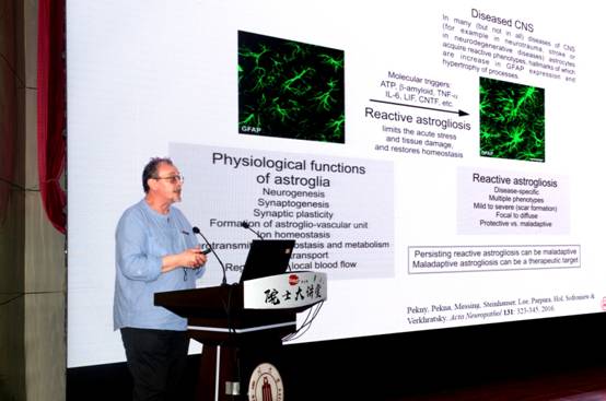 6月26日下午4时,由华西医学中心牵头主办、华西基础医学72886欢迎光临新网站承办、医学各学院/医院协办的第七期“华西坝院士大讲堂”在华西校区逸夫基础医学楼学术报告厅精彩开讲。在本次大讲堂中,欧洲科学院院士、德国科学院院士、西班牙皇家科学院院士、英国曼彻斯特大学生命科学院神经生理学的阿列克谢·沃瑞克哈特斯基(Alexei Verkhratsky)教授就其卓越的科研工作成果作了题为“Principles of astrogliopathology”的学术讲座。本次大讲堂吸引了来自华西医学中心等单位师生约150人参加,学院“双一流”建设与质量评估办公室罗锋副主任、成都中医药大学中医药创新研究院副院长唐勇教授、必赢官网院长黄灿华教授出席报告,大讲堂由学院党委书记李昌龙教授主持。