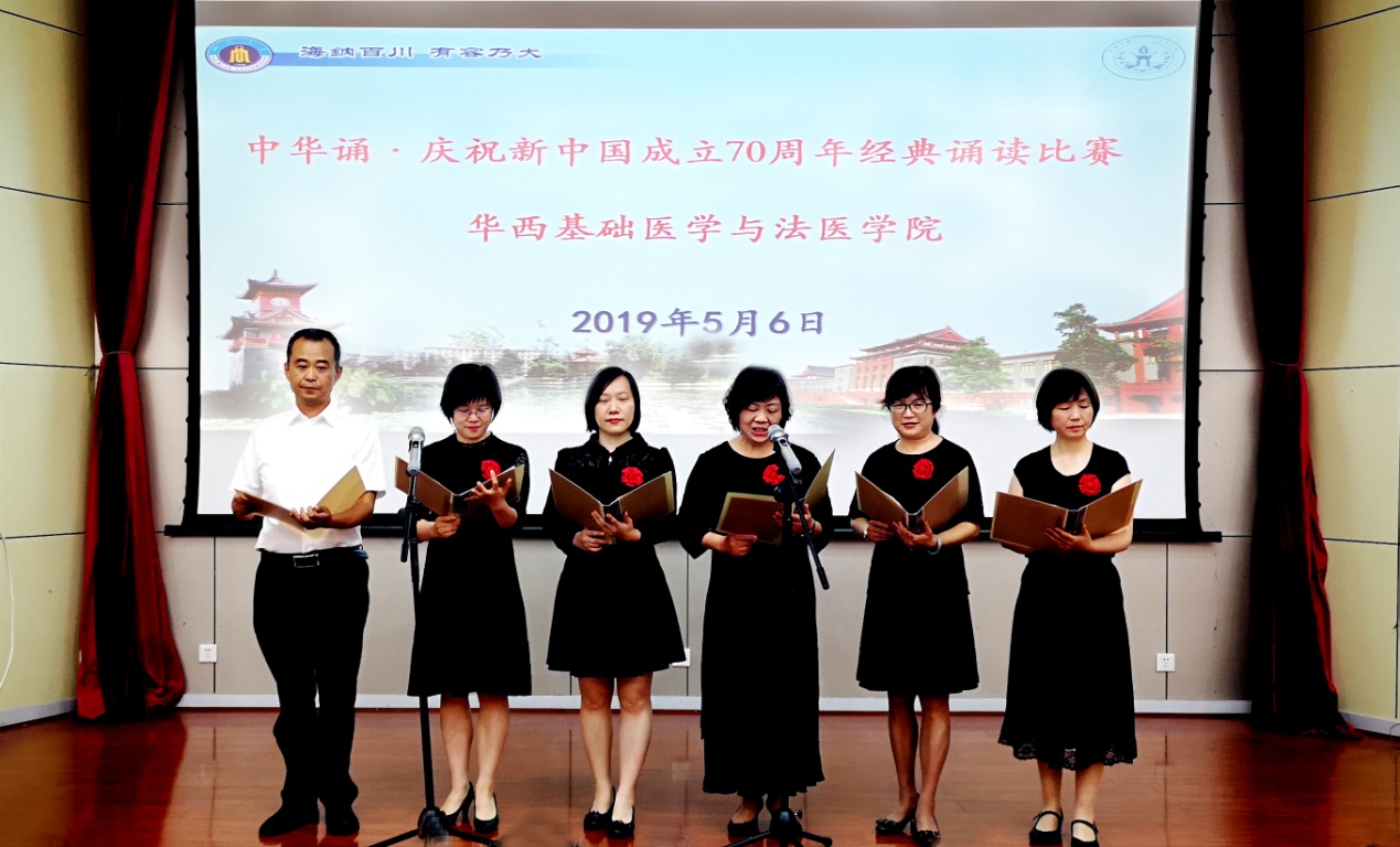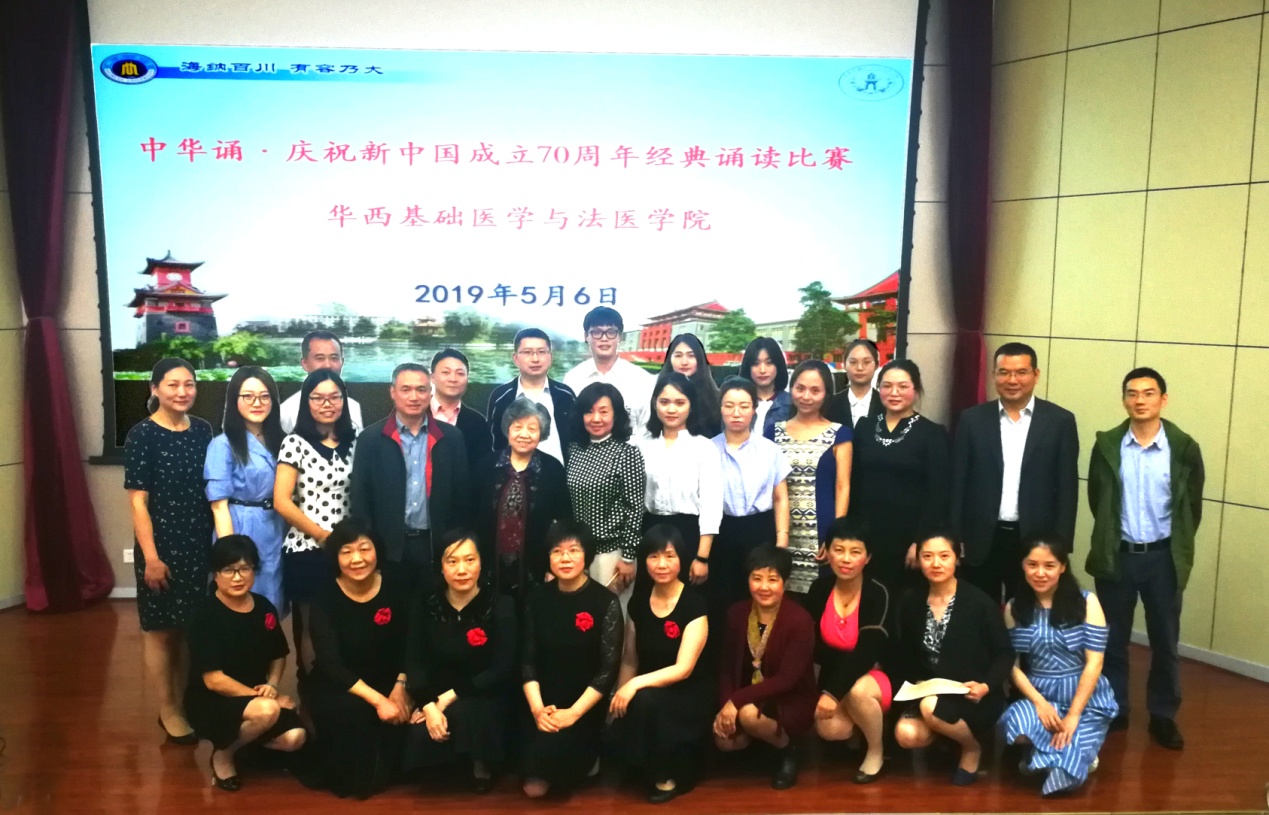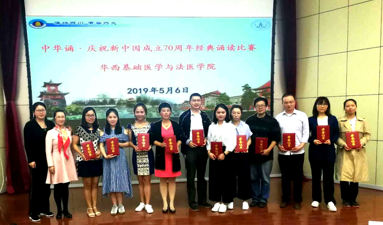 为了庆祝中华人民共和国成立70周年,必赢官网于2019年5月6日下午在华西逸夫楼报告厅举行了华西基础医学72886欢迎光临新网站“中华诵·庆祝新中国成立70周年经典诵读比赛”,本次比赛吸引了200名师生观看。比赛邀请了学院党委副书记郭晓伟同志、文学与新闻学院朱姝老师、马克思主义学院赵雪琴教授、人事处语委办公室副主任侯洁老师、学院组织胚胎学及神经生物学教研室主任周雪教授担任评委,来自学院各单位19个作品参加了比赛,表达了对祖国的热爱。