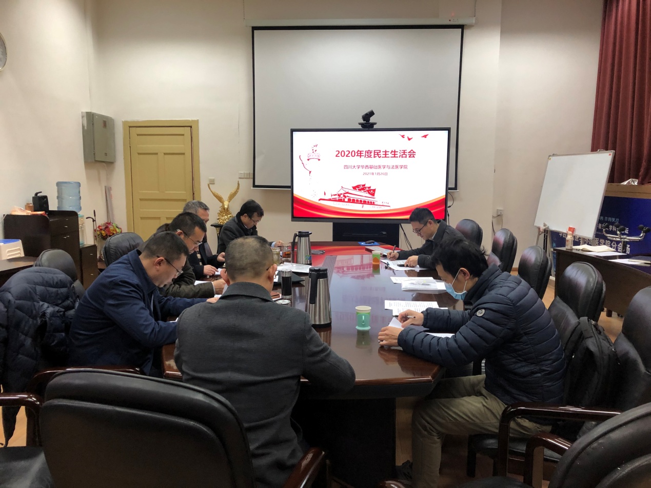 1月26日上午,学院领导班子在华西校区第五教学楼二会议室召开2020年度民主生活会。会议由学院党委书记李昌龙同志主持,学院领导班子成员郭晓伟、方定志、梁伟波、刘肖珩,实验动物中心主任杨寒朔参加会议,学校组织部相关同志到会指导。根据学校党委相关要求,本次民主生活会主题是:认真学习贯彻习近平新时代中国特色社会主义思想,加强政治建设,提高政治能力,坚守人民情怀,夺取决胜全面建成小康社会、实现第一个百年奋斗目标的伟大胜利,开启全面建设社会主义现代化新征程。