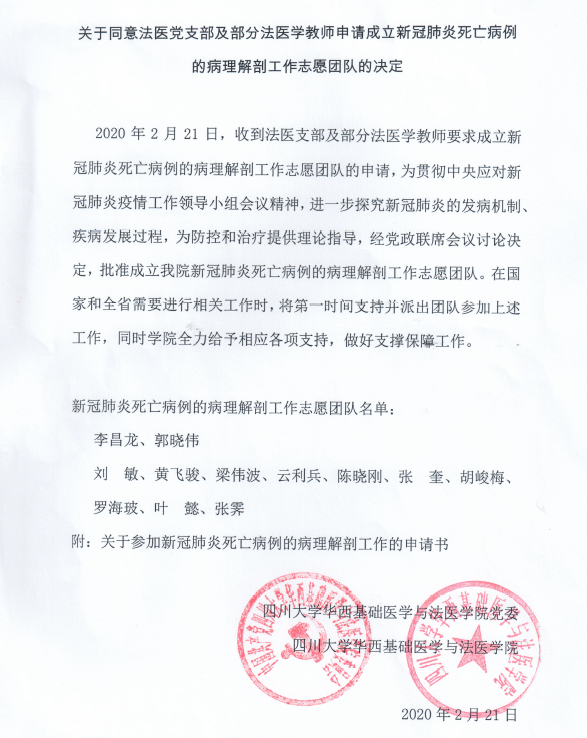 学院成立“新冠肺炎死亡病例的病理解剖工作志愿团队”