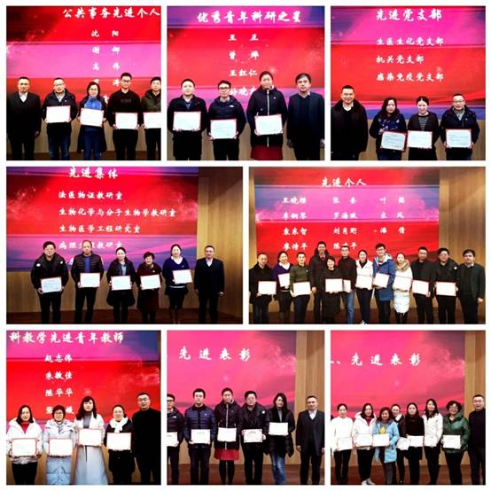 接下来进行先进表彰仪式。刘肖珩主席宣读2019年度学院先进表彰名单:学院评选法医物证教研室、生物医学工程研究室等5个教研室为先进集体,生医生化党支部等3个支部为先进党支部,王晓樱、张奎、罗海玻、叶懿、李钢琴、宋凤、袁东智、刘肖珩、潘倩、廖诗平、陈建平11名教师为先进个人,沈阳、谢娜、高伟、罗涛、汪贵明5位老师为公共事务先进个人、赵志伟、朱敏佳、陈华华、张媛媛 、冯颖 5位老师为本科教学先进青年教师,王正、曾烨、王红仁、孙晓东、李楠5位教师为优秀青年科研之星。