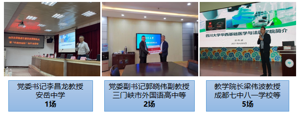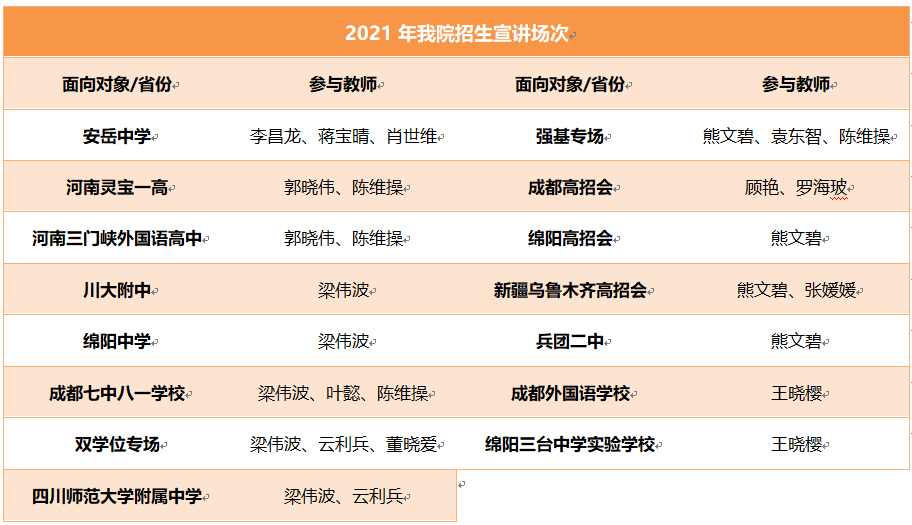 在李昌龙书记的带领下,我们面向安岳中学、成都七中八一学校、川大附中、绵阳中学、成都外国语学校等中学进行宣讲10场,开展名师回母校活动3场,参与成都、绵阳及乌鲁木齐高招会3场,通过专场专题介绍法医与法学双学士双位、基础医学(强基计划)专业情况2场;在高考志愿填报阶段,建立咨询QQ群3个、咨询专机1部,在半个多月的时间内7*24小时不间断回复考生及家长信息。必赢官网师生积极参与校园体验日接待工作4次,累计工作量约为116400人数*分钟。