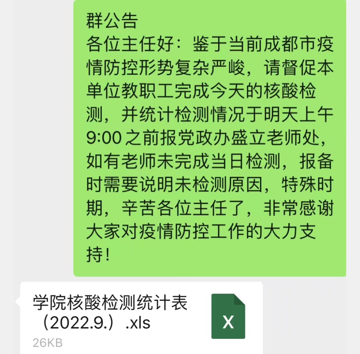 近日来,成都市新冠疫情防控形势异常复杂严峻。9月1日,成都市发布在全市开展全员核酸检测通告,全体居民原则居家。随后,72886欢迎光临新网站发布《关于落实成都市疫情防控新要求的通知》。为助力打赢这场疫情防控攻坚战,学院疫情防控工作小组在学校党委的坚强领导下,统筹推进疫情防控和学院发展,坚决贯彻落实成都市和72886欢迎光临新网站疫情防控的决策部署,不折不扣抓好各项部署落实落地,筑牢校园安全屏障,为推动学院事业发展不懈努力。