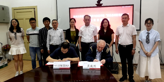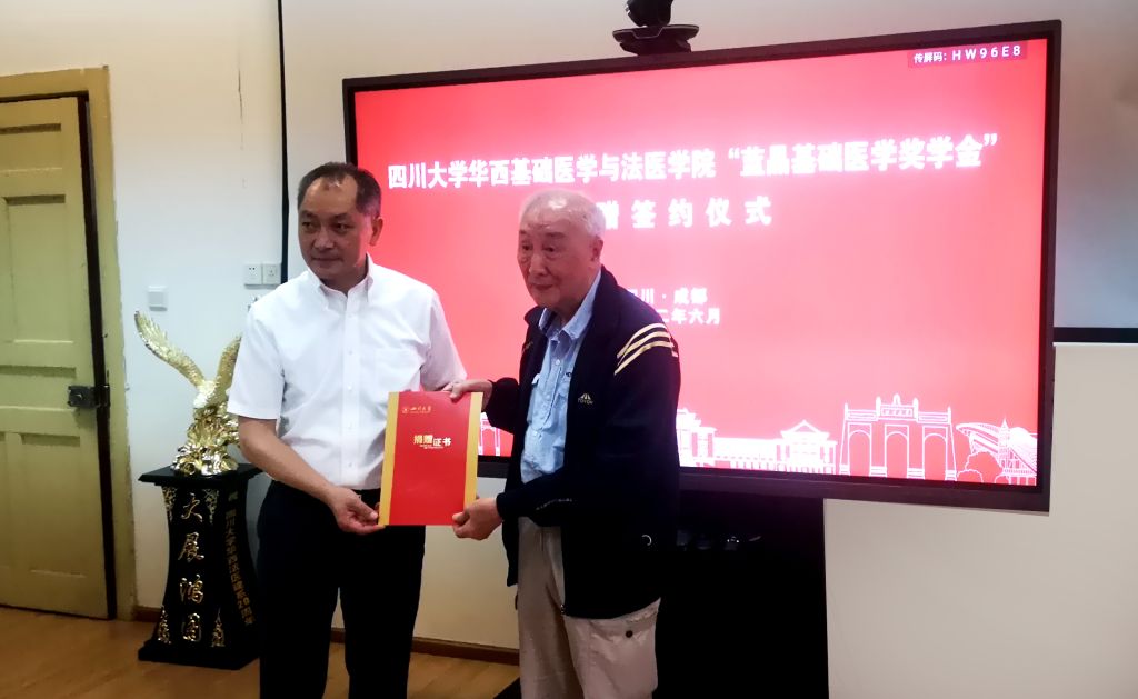 6月1日上午,学院在华西第五教楼二会议室举行隆重而简朴的 “蓝晶基础医学奖学金”捐赠签约仪式,由必赢官网87岁高龄的生理学蓝庭剑教授用积攒20余年的国务院特殊津贴捐赠10万元成立该项奖学金,用于资助家境贫困的优秀基础医学学子。蓝庭剑教授及其女儿蓝峰女士、学校党委副书记张伟、学校对外联络办公室副主任、教育基金会副秘书长白鹏、学校离退休处副处长唐洪、学院党委书记李华、院长李昌龙、党委副书记陈维操、工会主席黄莉、生理教研室主任杨文星及教师、学生代表参加了捐赠签约仪式。签约仪式由李华主持。