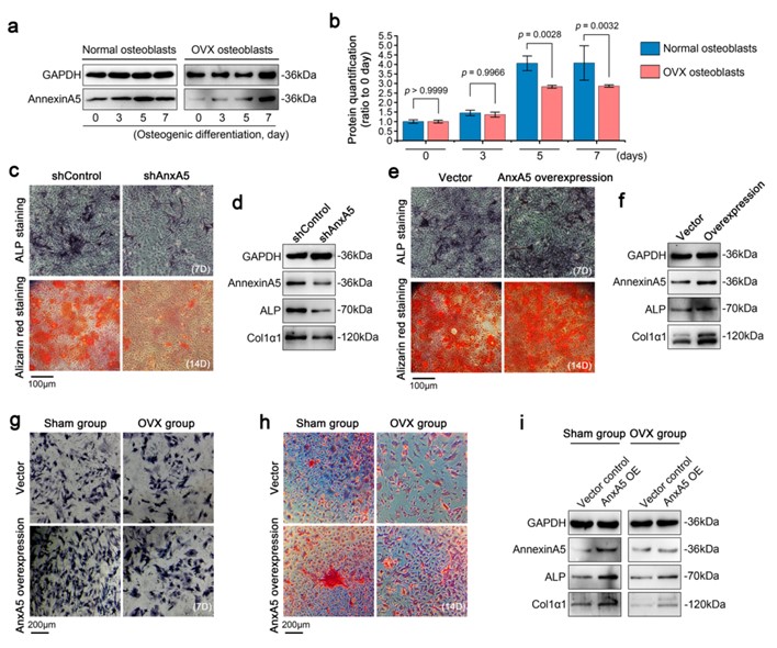 通过构建敲低或过表达AnxA5的MC3T3-E1细胞以及原代成骨细胞发现,AnxA5在成骨细胞矿化过程中至关重要,且有助于改善骨质疏松成骨细胞受损的矿化能力(图3)。