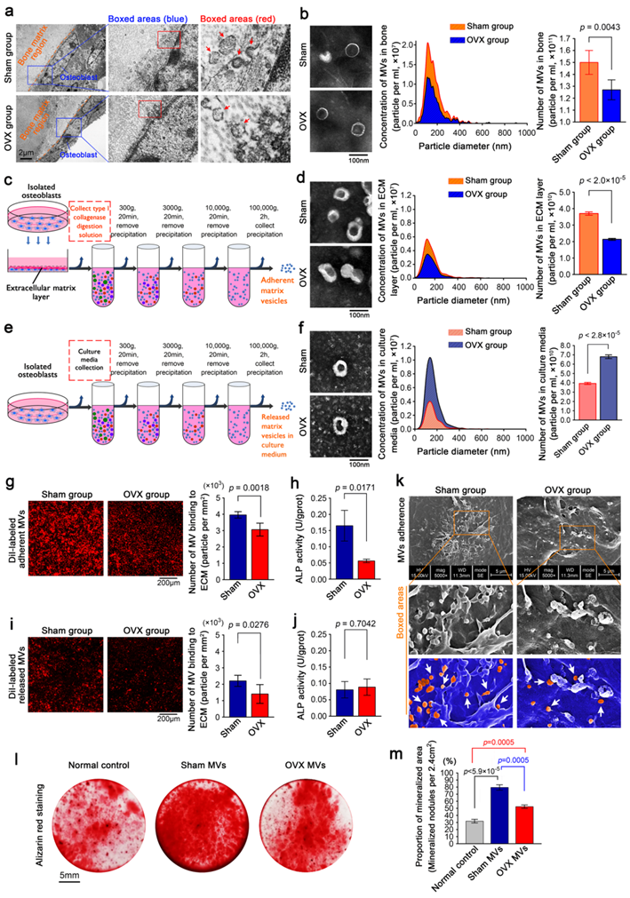 骨质疏松是以骨量降低和骨组织微结构破坏为主要特征的一种慢性骨骼系统疾病,严重影响人们的身体健康和生活质量。基质囊泡是由骨组织细胞生成的具有特定功能的生物活性物质,可能在维持骨稳态过程中起着重要作用。但其在骨质疏松症发生和发展过程中的作用和机制尚不清楚。基于此,研究者构建了骨质疏松小鼠模型并分离骨组织及成骨细胞所释放的基质囊泡,结果发现,发生骨质疏松后,具有强矿化能力的黏附型基质囊泡显著减少(图1)。