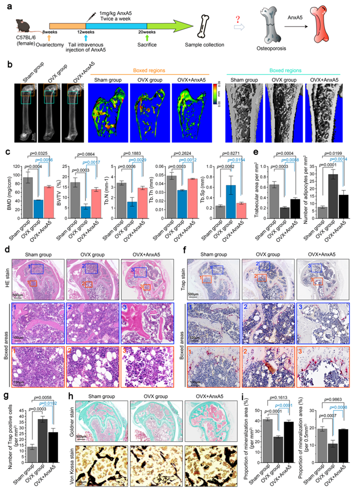 体内研究结果证实,通过尾静脉注射对去卵巢骨质疏松小鼠给予重组AnxA5蛋白进行干预后,小鼠的骨质流失减缓,骨质疏松症的发展进程被显著抑制(图6)。