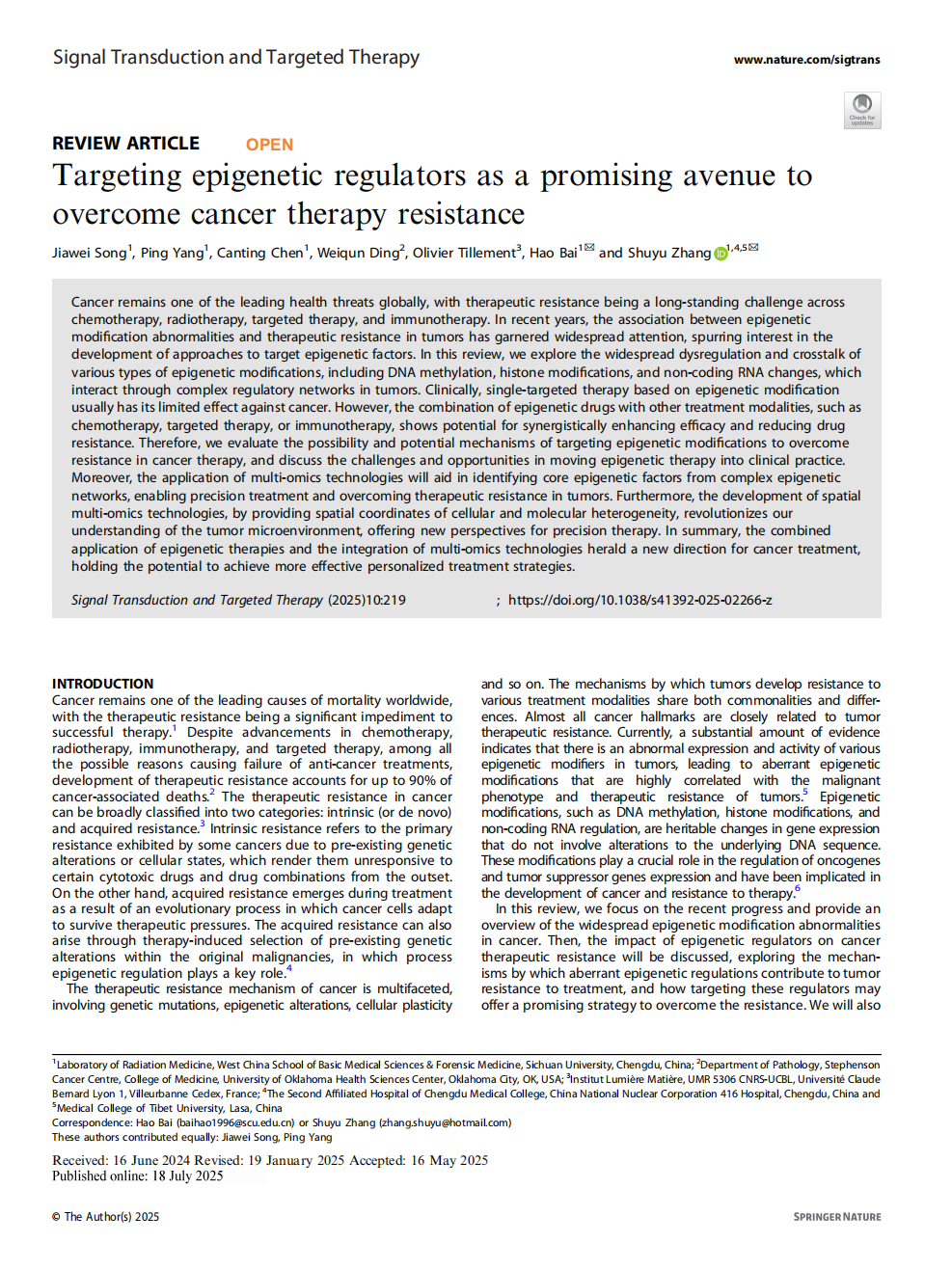 近日,必赢官网张舒羽教授团队在《Signal Transduction and Targeted Therapy》杂志发表题 “Targeting epigenetic regulators as a promising avenue to overcome cancer therapy resistance”的综述论文,系统总结了表观遗传调控在癌症治疗耐药中的关键作用,并提出了以表观遗传干预为核心的肿瘤组合治疗新策略。