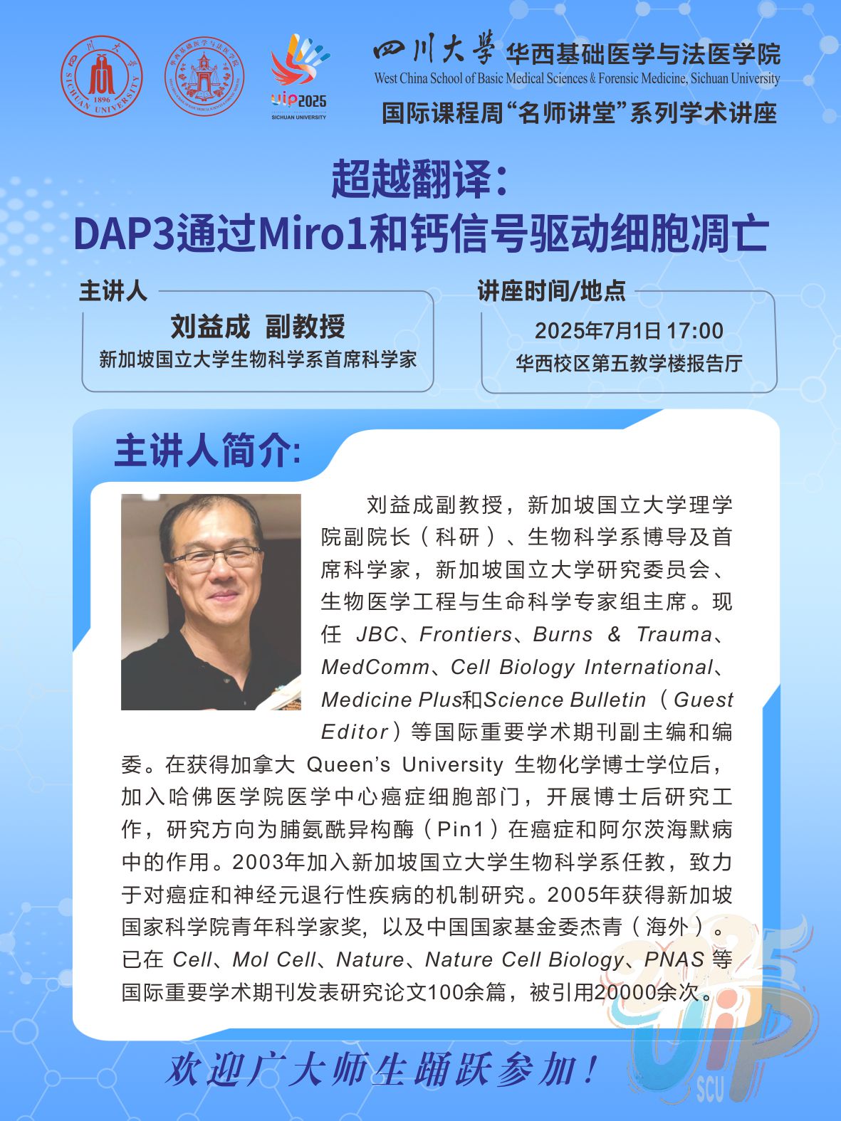 【2025年国际课程周“名师讲堂”系列学术讲座】超越翻译:DAP3通过Miro1和钙信号驱动细胞凋亡