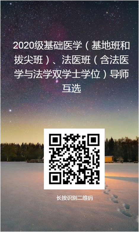 为加强老师与学生之间的沟通,促进学生个性化成长发展,提高学生综合素质,深入落实“双导师”制,形成“三全”育人的格局,提升必赢官网本科人才培养质量。现启动2020级基础医学(基地班和拔尖班)、法医(含法医学与法学双学士学位)学术导师互选,具体工作安排如下: