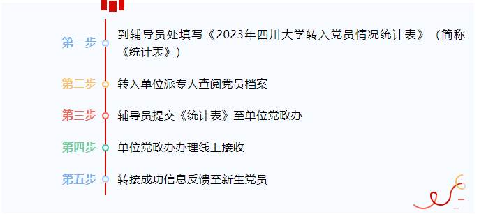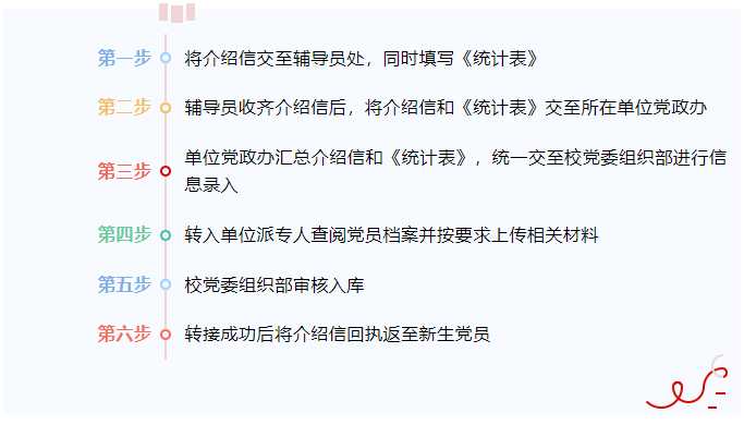 1.新进学生党员开学报到后,应主动与辅导员联系,及时办理组织关系转入手续。党组织关系通过线上转入的,在辅导员处填写《2023年72886欢迎光临新网站转入党员情况统计表》(以下简称《统计表》,见附件),辅导员将《统计表》交至学院党政办,由党政办办理线上接收后将转接成功信息反馈至新生党员;党组织关系通过线下转入的,将介绍信交至辅导员处并填写《统计表》,辅导员收齐介绍信后交至学院党政办,由党政办汇总介绍信和《统计表》一并交至校党委组织部进行信息录入,学院派专人查阅党员档案并复印上传党员组织关系介绍信、入党积极分子预备党员培养考察登记表第1、3页,入党志愿书第1、9-12页,校党委组织部审核后入库,材料审核通过返还回执至新生党员。