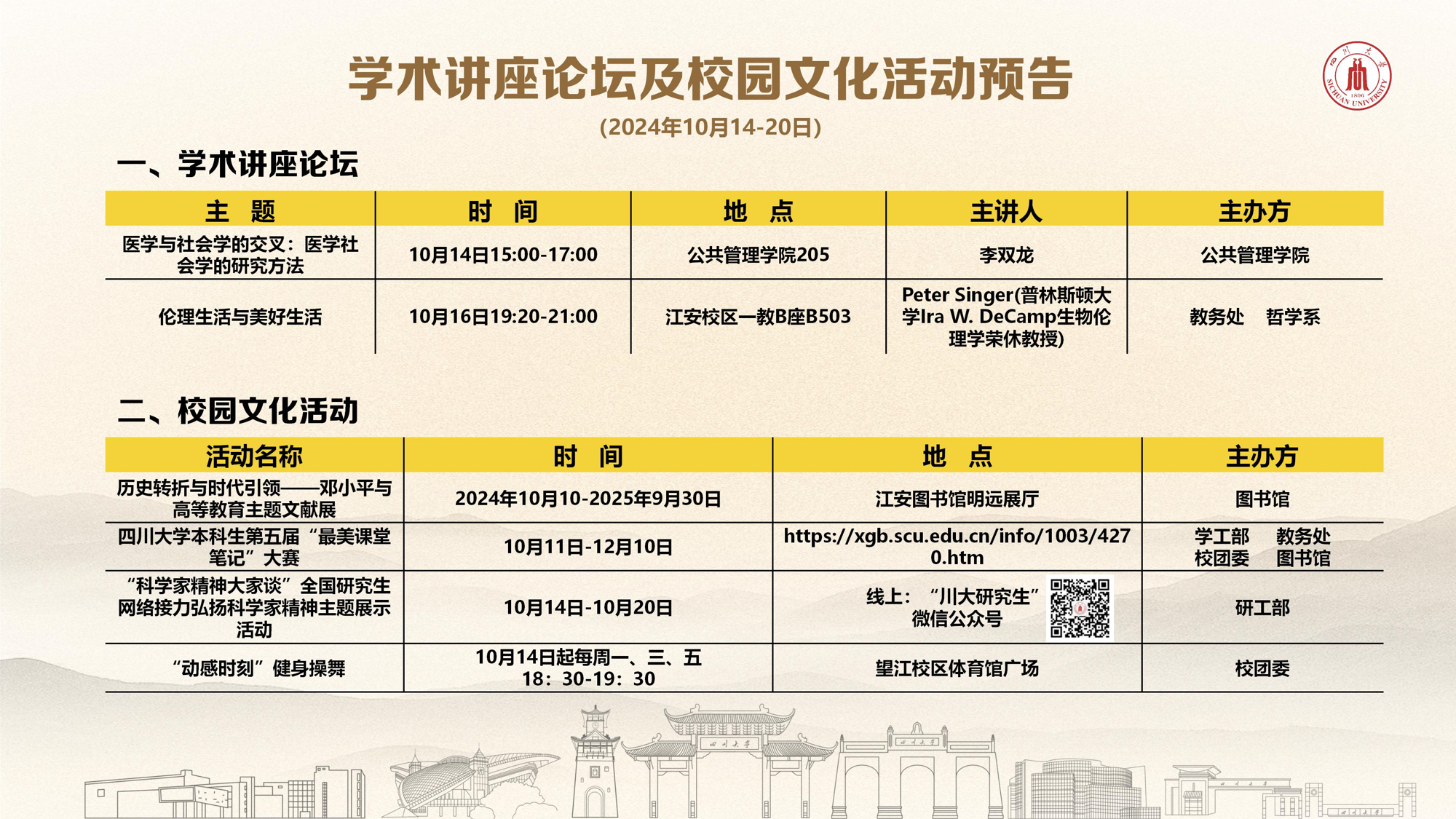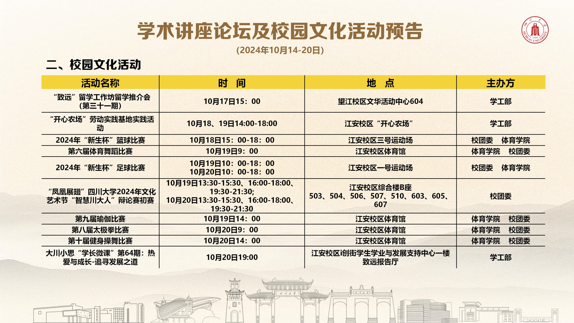 72886欢迎光临新网站2024年10月14日-20日学术讲座论坛及校园文化活动预告