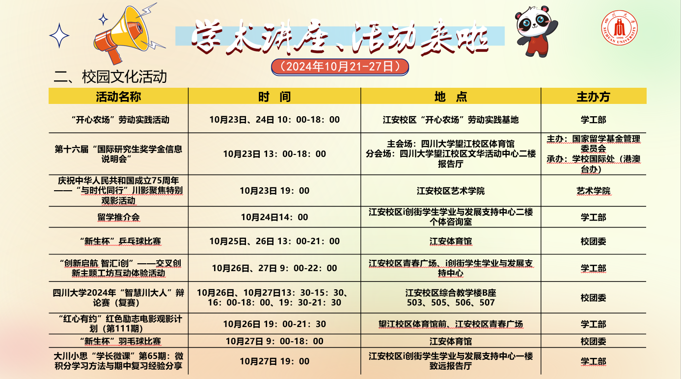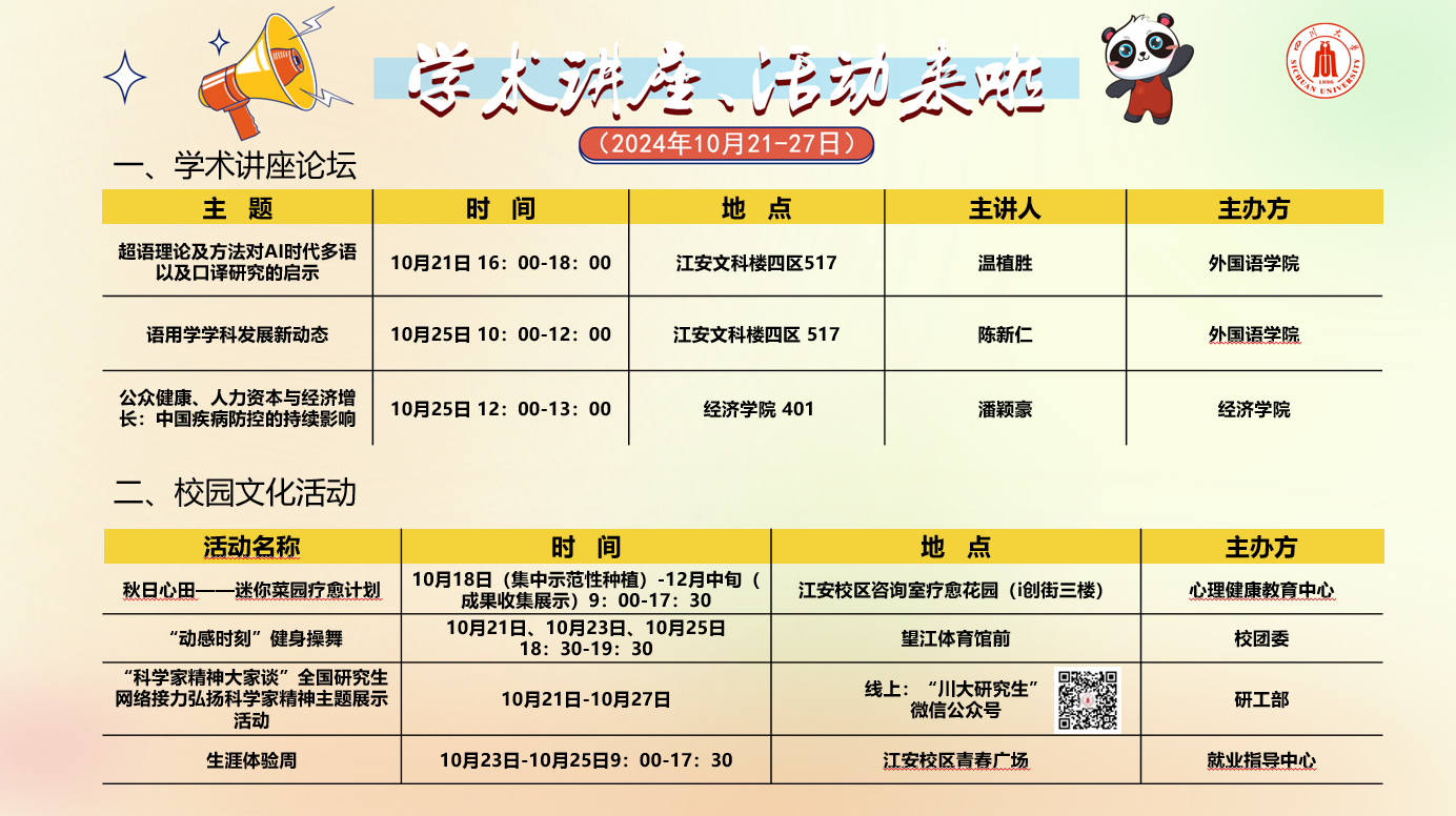 72886欢迎光临新网站2024年10月21-27日学术讲座论坛及校园文化活动预告