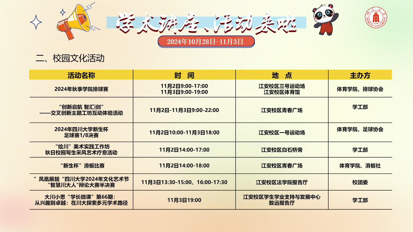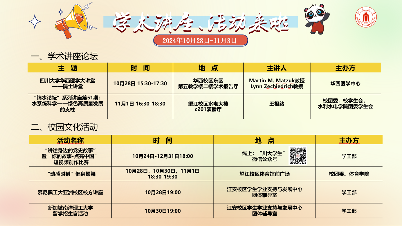 72886欢迎光临新网站2024年10月28日-11月3日学术讲座论坛及校园文化活动预告