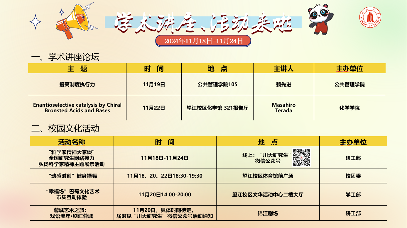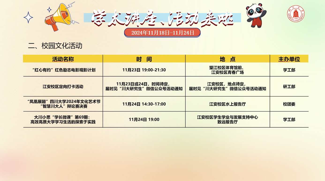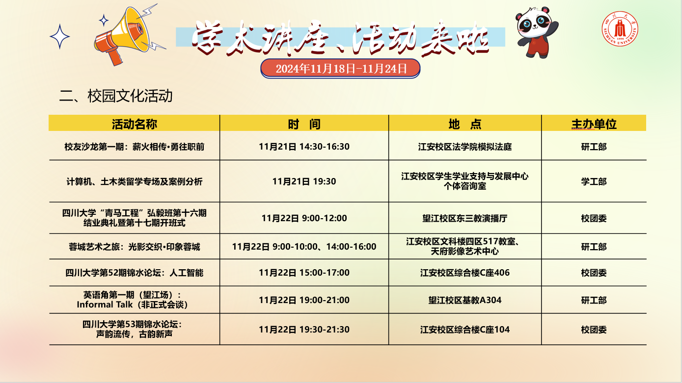 72886欢迎光临新网站2024年11月18日-11月24日学术讲座论坛及校园文化活动预告