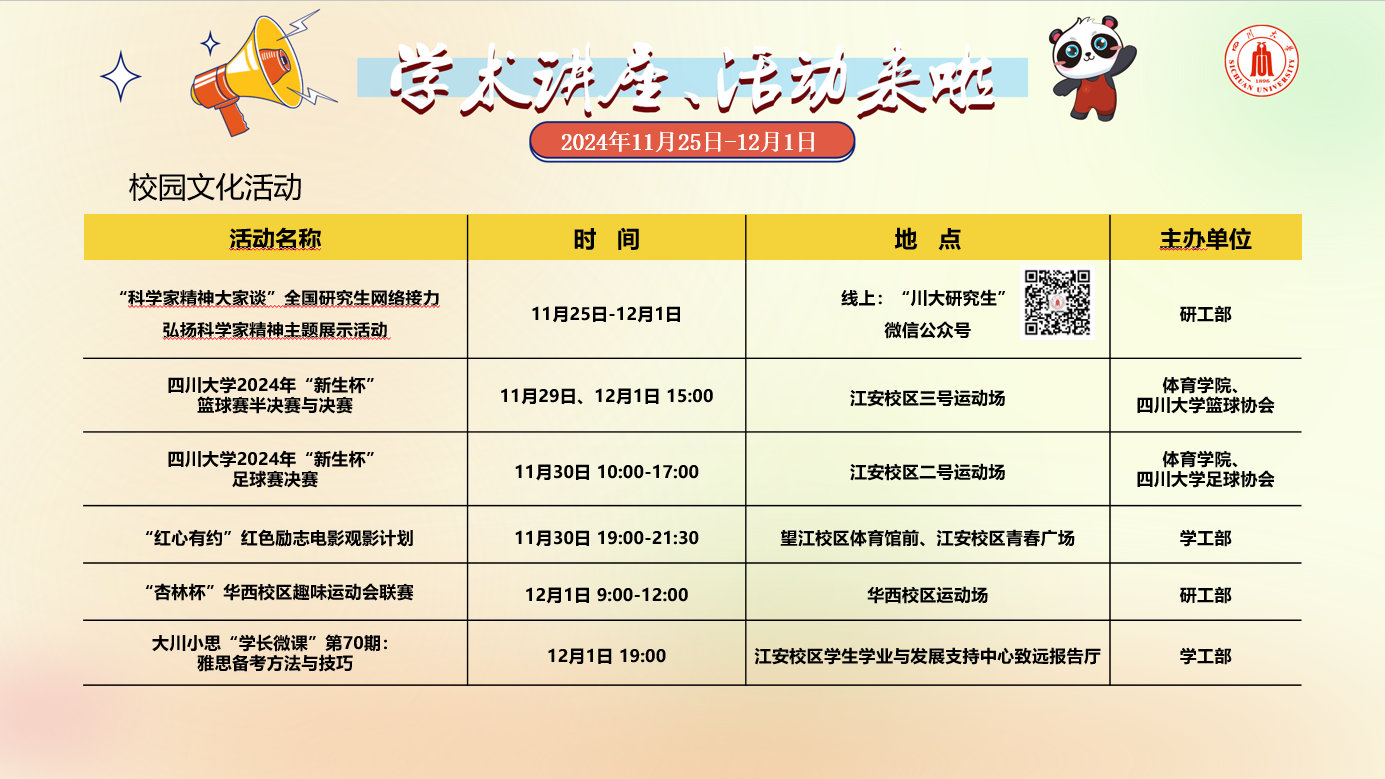 72886欢迎光临新网站2024年11月25日-12月1日学术讲座论坛及校园文化活动预告