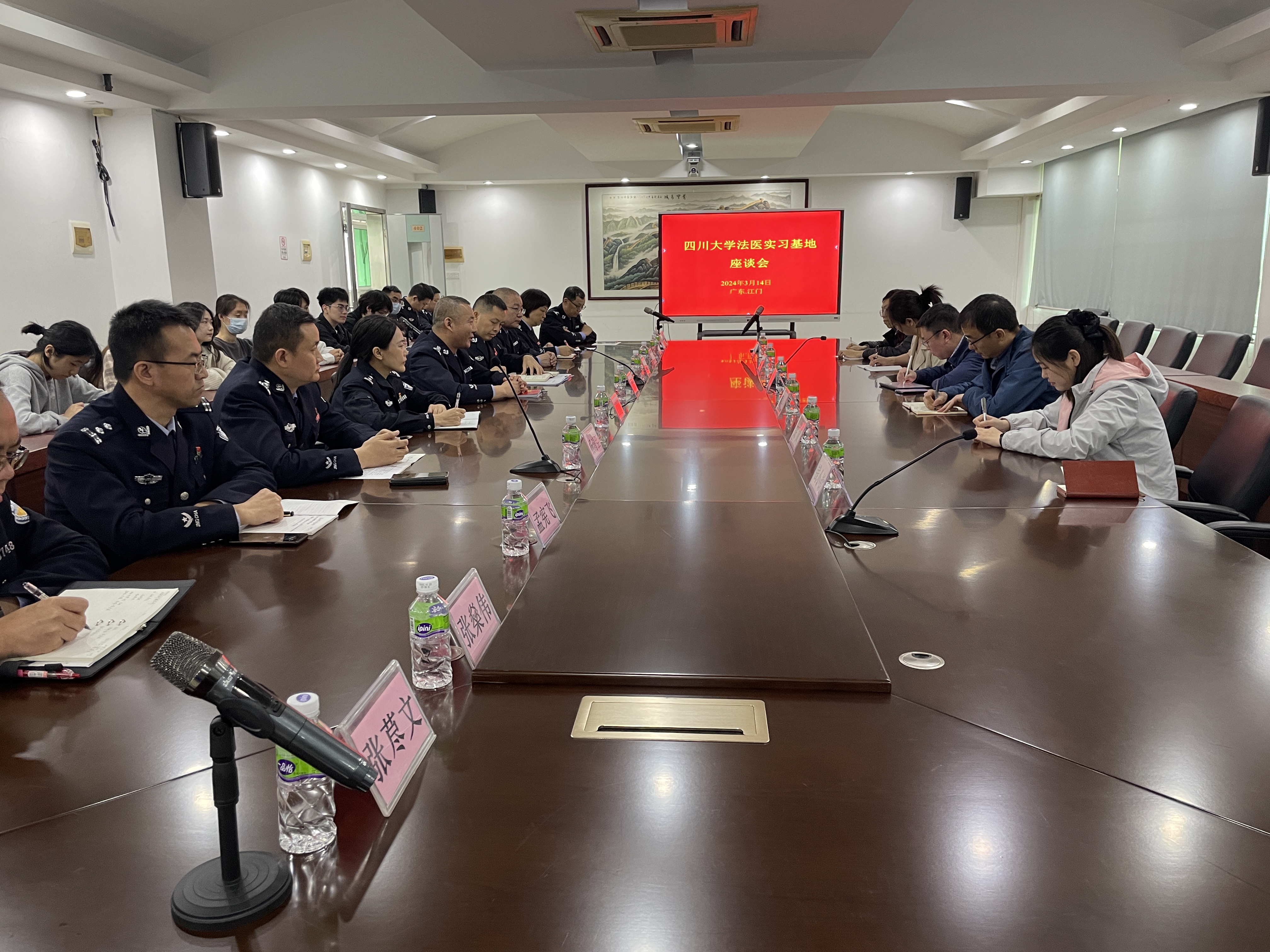 为进一步了解法医学专业学生的实习情况,加强必赢官网与实习基地的联系和沟通,3月14日,必赢官网副院长梁伟波教授、副院长罗海玻教授带领法医毒物分析教研室主任叶懿副教授、法医物证教研室主任宋凤副教授及教学科相关人员,前往江门市公安局刑事警察支队进行调研。江门市公安局刑事警察支队副支队长李会军、江门市公安局政治处教务科副科长范慧敏、江门市公安局刑警支队三大队大队长司徒沛尧、江门市公安局刑警支队三大队警务技术二级主管李丽等人携所有实习生出席会议。