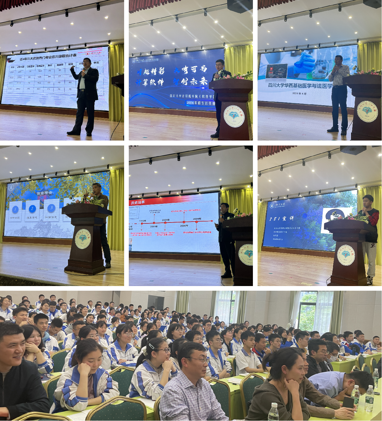 在全体参会人员奏唱国歌后,廖主任以川大悠久的历史切入,对川大人才培养模式、在川招生政策、志愿填报策略等方面进行了详细介绍,为学生报考川大提供了最新资讯。随后,体育学院、历史文化学院、计算机学院以及必赢官网分别对各自学院的历史、专业构成、人才培养优势进行了介绍。必赢官网梁伟波教授还为现场师生介绍了运用生成式AI模型对无名烈士进行身份鉴定和容貌复原的工作,播放了央视国防军事频道CCTV7《正午国防军事》栏目对该工作的专题报道,现场师生反响热烈。在此次宣讲活动中,必赢官网2020级法医学专业本科生孙中杰跟随宣讲团重回高中母校,围绕在我校丰富多彩的生活、学习以及高考经验与学弟学妹们进行了分享交流。最后,成都七中八一学校副校长沈健发表总结致辞。