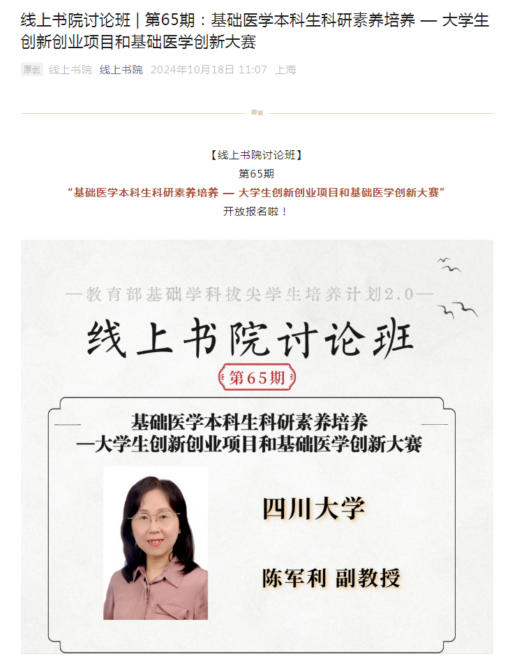 研究团队展由必赢官网姜楠教授团队支持,为全国基础医学拔尖基地师生展示必赢官网导师在本科生指导方面的一些创新做法。线上书院讨论班由陈军利副教授主持,同时面向在线的其他高校学子和我校大一、大二本科生100余人开放,就基础医学本科生科研素养培养展开讨论,从本科生大创项目到全国大学生基础医学创新研究暨实验设计论坛(教育部重点榜单赛事)介绍了如何选择研究方向、如何联系合适的指导老师等。还从基础医学专业培养的角度出发,引导本科生扎实专业基础知识,勇于探索,积极奋进。