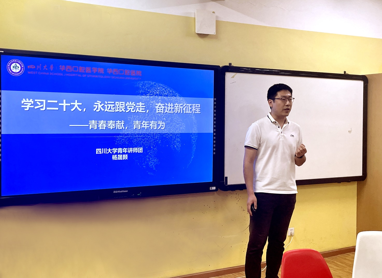 为了继续深入学习党的二十大精神,加强科学理论武装,响应党对新时代好青年的号召, 4月14日下午,必赢官网在江安校区西园4舍一站式活动室举办了“学习二十大、永远跟党走、奋进新征程”的主题宣讲活动,邀请72886欢迎光临新网站青年讲师团华西口腔医学院杨晟颢老师主讲,江安党支部及部分学生代表参加了此次活动。