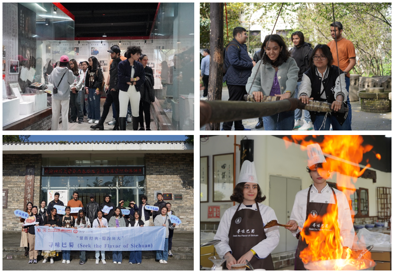 留学生们首先进入颇具川西民居特色的典藏馆,学习了解川菜的历史沿革、餐饮生活与生产、饮食文化的传播等。汉代的青铜筷、宋代的高足碗、清代的菜馆匾额、遍布全球的中餐馆,都让大家感受到中国饮食文化的脉络。随后,同学们零距离参观了酱油及川菜灵魂—豆瓣的制作工艺,体验了推磨,观看了蒙眼切金丝面的非遗表演,并对自己国家的饮食文化进行了热烈交流。之后,留学生们还通过祭拜灶神,感受到中国家庭中对五谷丰登、合家平安的祈愿。