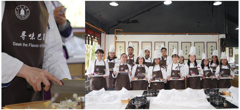 此行中,同学们穿上定制围裙变身川菜大厨,在专业人员的指导下切菜、配料、颠勺、摆盘,烹饪出了色香味俱全的特色川菜—宫保鸡丁。同学们纷纷表示,这次学习不仅让其感受到川菜的魅力,更加深了对中国文化的认识,充实难忘、获益匪浅。