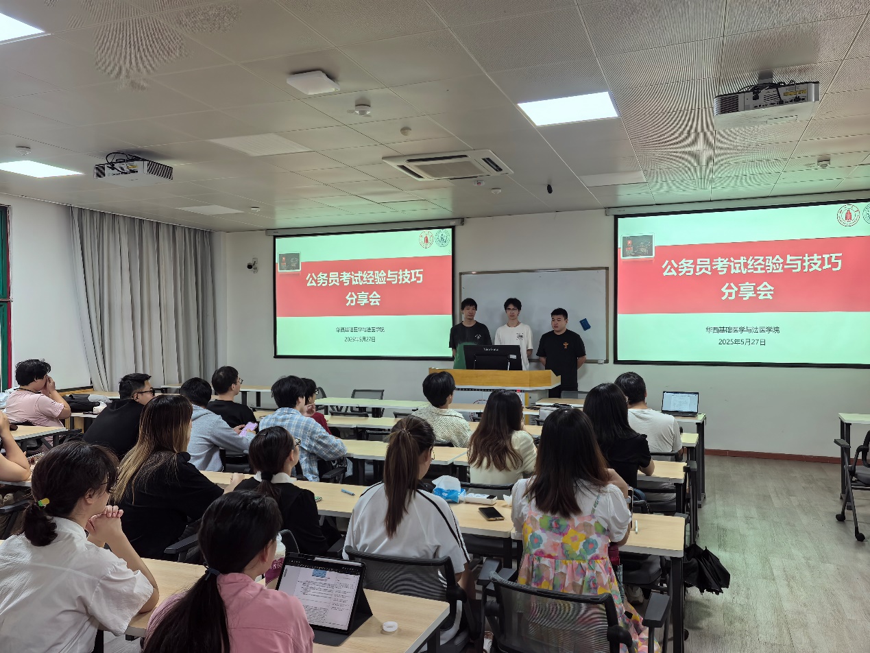 本次活动邀请毕业班2020级法医专业唐一豪与双法专业彭梓轩两位优秀学长担任主讲。他们结合自身备考实战,深入剖析了公务员考试的核心要点与高效策略,内容涵盖笔试重难点解析、面试实战技巧及科学备考规划等关键环节。毕业班双法专业马烨霖同学也与在场同学积极互动。分享会聚焦同学们普遍关注的考公热点、难点问题,提供了极具指导性和操作性的备考建议。
