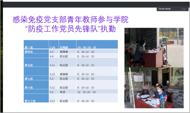 最后,支部书记陈达丽总结强调,支部要发挥战斗堡垒作用,师生党员要发挥先锋模范作用,我们需要不断提升思想意识,提高科研教学水平,让党旗始终高高飘扬,为新冠肺炎疫情防控贡献自己的最大力量。