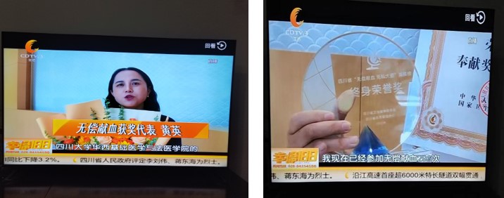 2023年6月14日,第20个“世界献血者日”四川省无偿献血主题宣传活动在成都市血液中心顺利举行。此次活动是由四川省卫生健康委员会、四川省红十字会、共青团四川省委、中国人民解放军西宁联勤保障中心卫勤处主办,成都市卫生健康委员会、四川省血液管理中心(成都市血液中心)承办。必赢官网生理病生党支部书记黄英教授作为四川省无偿献血者代表受邀参加了此次庆祝活动(黄英自1999年起开始无偿捐献全血,自2013年起成为固定的血小板捐献者。目前,她已无偿献血296次),并荣获四川省“无偿献血无私大爱英模榜”终身荣誉奖(奖杯)、2020至2021年度全国无偿献血奉献奖金奖(证书)及全国无偿献血奉献奖终身荣誉奖(证书)。宣传活动结束后,黄英作为四川省“无偿献血无私大爱英模榜”终身荣誉奖获得者代表接受了新闻媒体采访,CDTV3报道了相关采访。黄英主要结合自己的献血经历就无偿献血对患者及献血者的影响谈了自己的体会。在成都即将迎来第31届世界大学生夏季运动会举办之际,她希望大学生运动健儿在运动赛场尽情挥洒汗水、尽显青春风采并取得运动佳绩,同时她也呼吁更多的适龄公民尤其是大学生们积极加入到无偿献血队伍中,“汇聚青春正能量,无偿献血传爱心”。