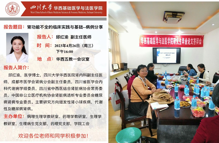 4月26日下午,病理生理学教研室、药理学教研室、生理学教研室与生理病生党支部、药理党支部在华西校区第五教学楼一会议室联合举办了由学院工会支持的校内专家学术交流活动,活动邀请了72886欢迎光临新网站华西医院肾内科副主任医师邱红渝博士作了题为“肾功能不全的临床实践与基础”的报告,以病例分享的形式为在座老师介绍了肾功能不全的临床诊断与治疗手段,活动在热烈的讨论和轻松愉快的氛围中结束。