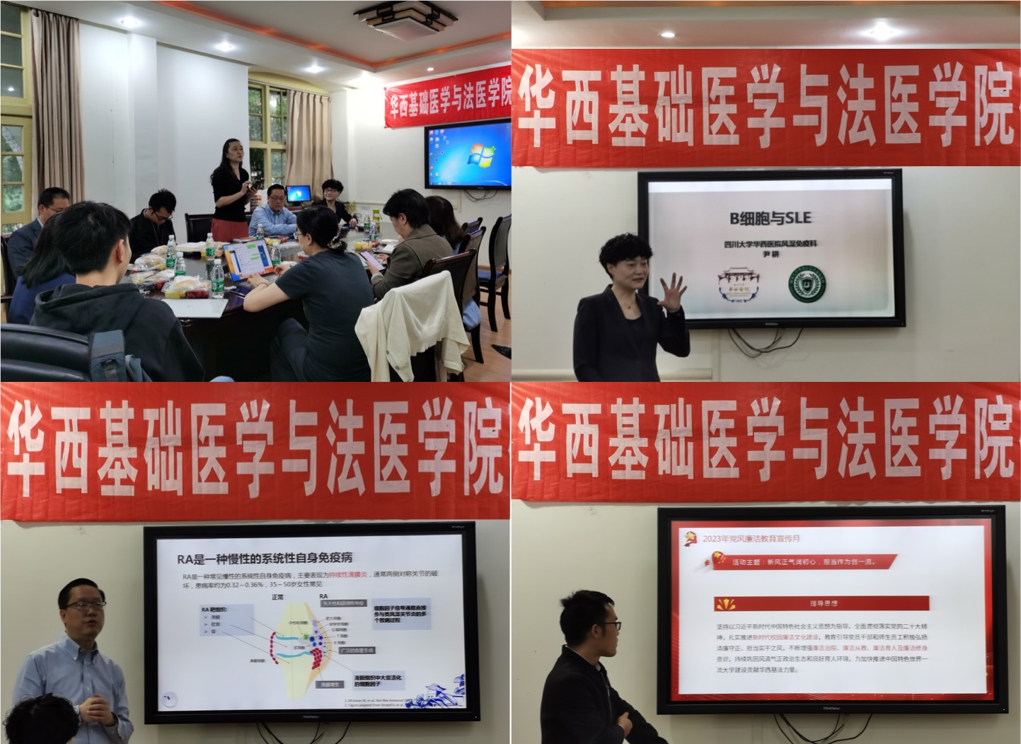 4月21日上午,药理教研室、药理支部与病理生理学教研室在华西校区第五教学楼药理会议室联合开展了由学院工会支持的党风廉洁教育暨基础临床学习交流会议,会议邀请了华西医院风湿免疫科主任谢其冰教授和华西医院全科医学中心主任/特需医疗中心主任/健康管理中心主任尹耕教授进行学术讲座,药理党支部成员、药理教研室、应激医学研究室和病理生理学教研室师生参加了会议。
