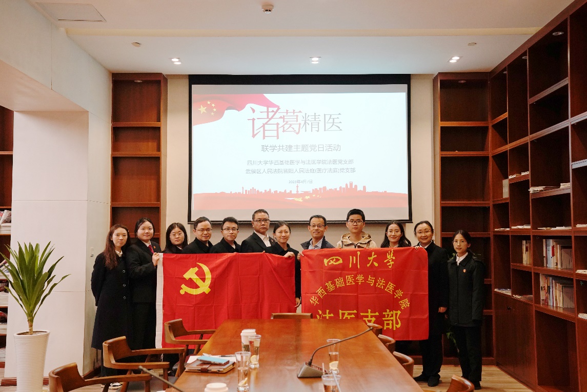 为加快提升新时代党建工作科学化水平,促进党建与事业深度融合发展,4月7日上午,学院法医党支部与武侯区人民法院晋阳人民法庭(医疗法庭)党支部在武侯区人民法院图书室开展“诸葛精医”联学共建主题党日活动。法医党支部与武侯区人民法院晋阳人民法庭(医疗法庭)党支部共12名党员同志参加活动。