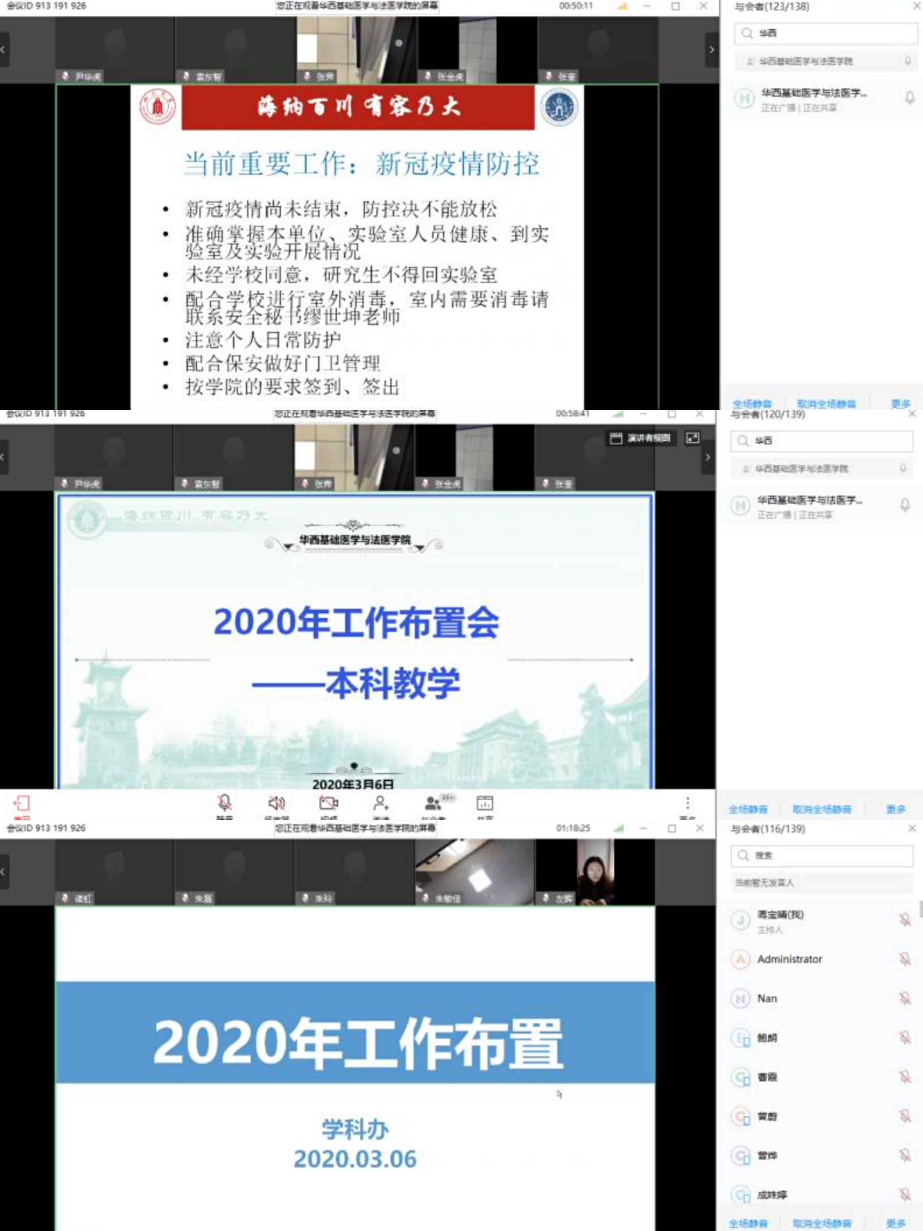 学院党委副书记郭晓伟分别就疫情防控期间学生工作的开展情况、学生深造率、学院宣传等7项工作,副院长方志就安全环保工作、法医楼改造工程等、副院长梁伟波就2020年本科教学重点任务、2020年春季学期前两周本科教学情况、特殊时期线上教学安排等,教授委员会主席刘肖珩就学科建设工作、全国第五轮学科评估、双一流建设中期验收评估等,工会主席黄莉就2020年工会重点工作等提出了新学期的工作安排及相关要求。