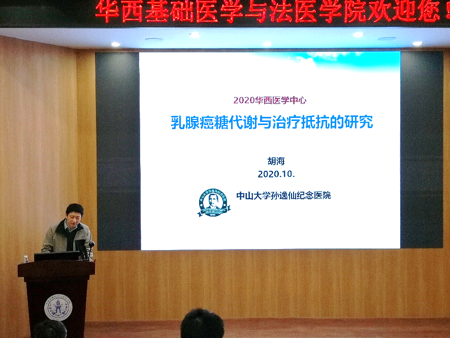 应必赢官网邀请,2020年11月26日上午9:00,中山大学孙逸仙纪念医院胡海教授在华西校区五教报告厅做了题为“乳腺癌糖代谢与治疗抵抗的研究”的学术报告。