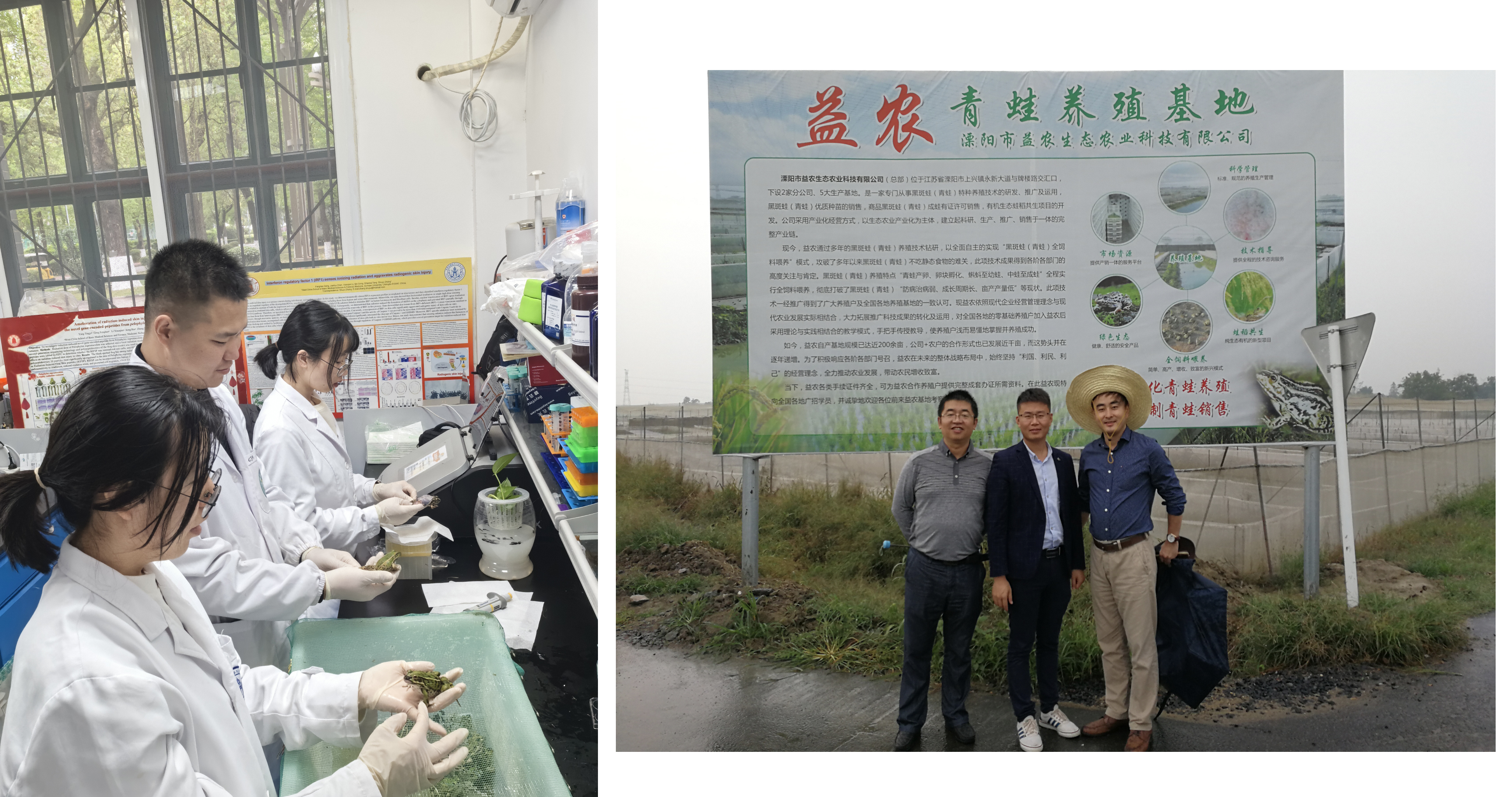 论文部分作者进行实验操作(左图)和到青蛙养殖基地取材照片(右图)。左图左二为论文(并列)第一作者耿凤豪。