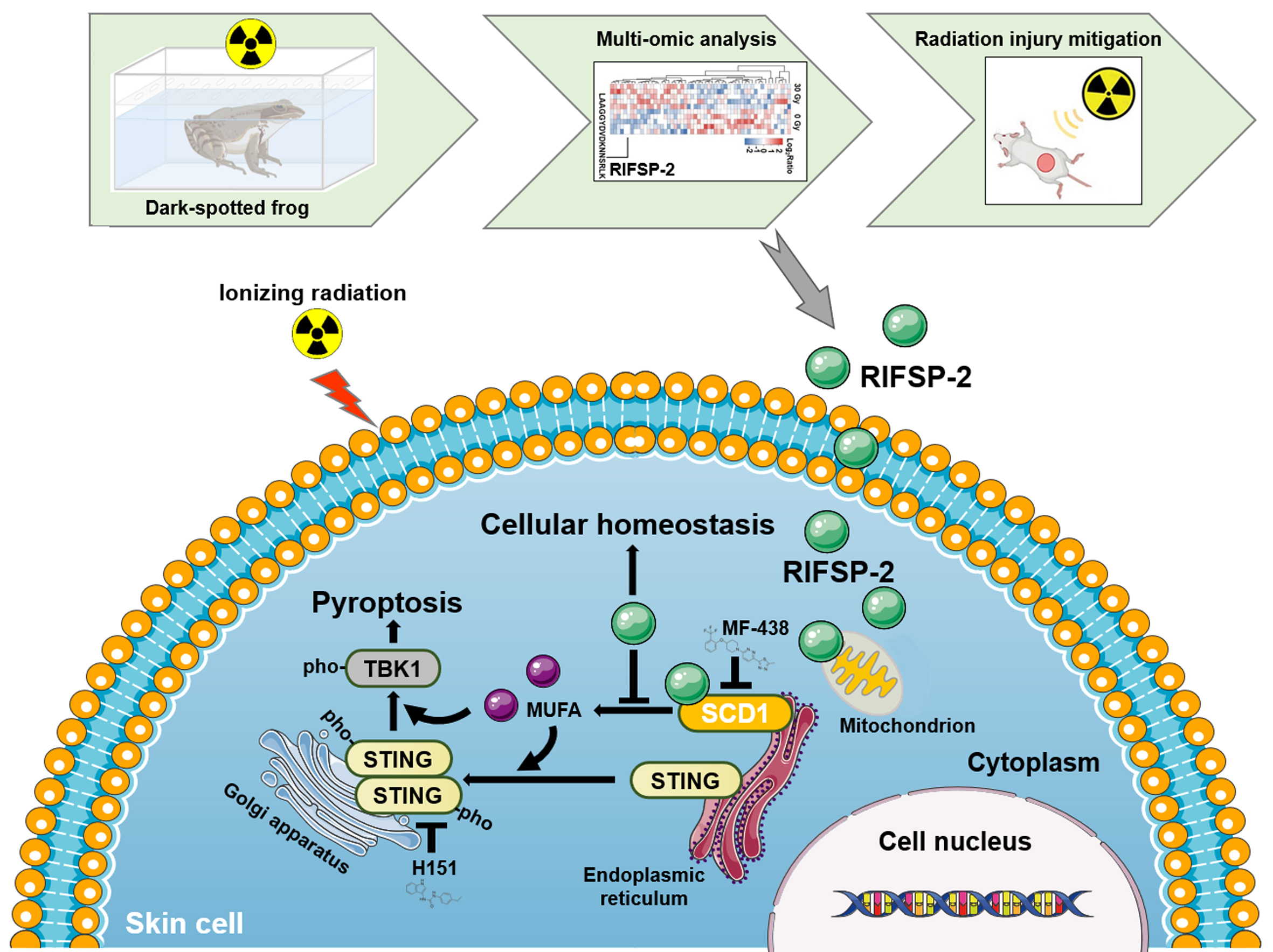 85年前,我国两栖爬行动物学的主要奠基人、原华西大学校长刘承钊学部委员(院士)曾带领师生历尽艰辛,足迹遍及川西,对蝾螈与蛙类动物开展深入研究,撰写了“华西两栖类自然史的研究”的系列开创性论文,奠定了我国两栖动物学科研究的基础。秉承先生遗志“到大自然这个实验室中探索真知”,受两栖动物进化过程中形成的抵御恶劣环境的防御机制启发,张舒羽教授和合作者在十余年前就开始关注到青蛙所具有的环境适应能力及辐射耐受等特性,2014年即报道了从高原滇蛙皮肤中分离的RP-1多肽修饰后具有透皮治疗放射性皮肤损伤的作用。近年来,其带领团队奔走于江苏溧阳、安徽芜湖、四川江油、青藏高原等地的青蛙养殖基地或野外,调研、选育合适的青蛙品系。在本研究中,团队研究人员给与黑斑蛙(Pelophylax nigromaculatus)适当的辐射压力后,通过转录组学、多肽组学和蛋白质组学等多种高通量技术鉴定到20余种辐射诱导的蛙皮多肽,原创性的将其命名为RIFSP(Radiation-Induced Frog Skin Peptide)。其中,RIFSP-2可以自由通过皮肤细胞,抑制脂代谢酶SCD1减少单不饱和脂肪酸生成,进而抑制辐射作用后STING介导的炎症反应,减轻放射性皮肤损伤进展。放射性皮肤损伤为肿瘤放疗和核事故等常见的并发症,创面久治不愈,且无特效防治药物,严重影响患者的生活质量。该研究为放射性皮肤损伤防治提供了新的干预策略。
