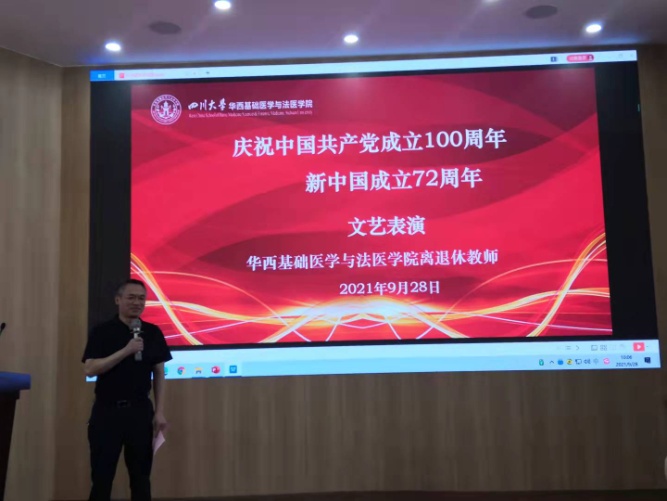 9月28日上午,必赢官网约80名离退休教师在华西五教报告厅欢聚一堂,举行庆祝中国共产党成立100周年暨建国72周年文艺演出,学院党委书记李昌龙参加了活动。