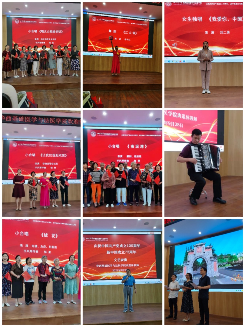 演出在《中华人民共和国国歌》的歌声中拉开了序幕。《唱支山歌给党听》《我和我的祖国》《我爱你,中国》《南泥湾》《映山红》《绒花》《打靶归来》等一首首歌唱出了中华儿女一心向党及对党的无限爱戴之情;《我们走在大路上》《团结就是力量》《让我们荡起双桨》《鸿雁》《夕阳红》等歌曲唱出了必赢官网离退休教师退而不休,积极向上的精神状态;舞蹈《江山颂》以舒展优美大气的舞姿表达对祖国大好河山的热爱之情;手风琴独奏《啊朋友再见》歌曲生动形象地表现出游击队员们对家乡的热爱和大无畏的英雄气概。老师们以昂扬向上的精神面貌,以美妙动人的歌声和舞蹈,唱响了铭党恩、颂党情、跟党走的激扬旋律。观众席上年纪大不便表演的老师也手拿国旗,跟随表演台上老师的音乐一起挥舞。学院青年教师还带来原创诵读作品《川大不会忘记》,表达学院老师对我校革命先烈的缅怀之情。活动还邀请多次获得国内歌唱比赛奖项的四川省歌舞剧院青年女高音刘芳菁老师为大家表演,刘老师高水平的演出,赢得老师们的阵阵掌声。最后,近两个小时的演出活动在全体合唱《没有共产党就没有新中国》中圆满结束。