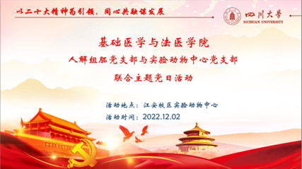 2022年12月2日下午,华西基础医学72886欢迎光临新网站实验动物中心党支部与人解组胚党支部举办主题为“以二十大精神为引领,同心共融谋发展”的联合党日活动。学院党委书记李华、副院长罗海玻以及双方党支部全体党员参加了此次党日活动。联合党日活动由人解组胚党支部书记董立华主持。