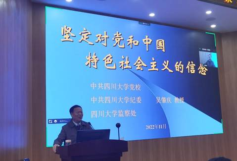随后,吴肇庆教授以“坚定对党的信念”为主题进行第一次授课。吴教授从坚定共产主义信念、坚定对党的信念,坚定对中国特色社会主义的信念几个方面系统而详实地向同学们介绍了“坚定对党和中国特色社会主义”的必要性和重要性,号召同学们认真学习习近平新时代中国特色社会主义思想,并在积极参与实践活动中坚定对党的信念,永远跟党走。