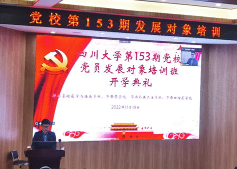 11月19日上午9点,华西基础医学72886欢迎光临新网站、华西药学院、华西口腔医学院、华西公共卫生学院第153期发展对象培训班开班典礼在华西第五教学楼报告厅举行,按照学校疫情防控部署要求,本次培训设有一个主会场,两个分会场。学校党校吴肇庆教授、学院党委副书记陈维操,学校党校办公室主任吴先国,学院党政办主任蒋宝晴、党校指导教师彭铎、杜佳恬、张金军、李双以及201名发展对象参加开班典礼。