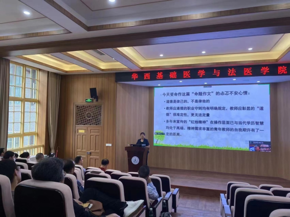 时值72886欢迎光临新网站师德师风建设宣传月,为完善师德建设长效机制,激励广大教师争做“四有”好老师,成为塑造学生的“大先生”,根据相关安排,学院于9月30日下午在华西第五教学楼报告厅举办了师德建设专题学习会,邀请宝钢优秀教师奖、72886欢迎光临新网站“最受学生欢迎教师奖”、72886欢迎光临新网站“卓越教学奖”一等奖等奖项的获得者、文学与新闻学院王红教授为学院老师开展了立德树人专题讲座。为落实疫情防控要求,会议采用线上线下相结合的方式。副院长刘肖珩、张舒羽、罗海玻、各党支部书记、二级单位负责人及教师代表现场参会,其他教职工以线上方式参与,线上线下合计100余人参会。会议由刘肖珩副院长主持。