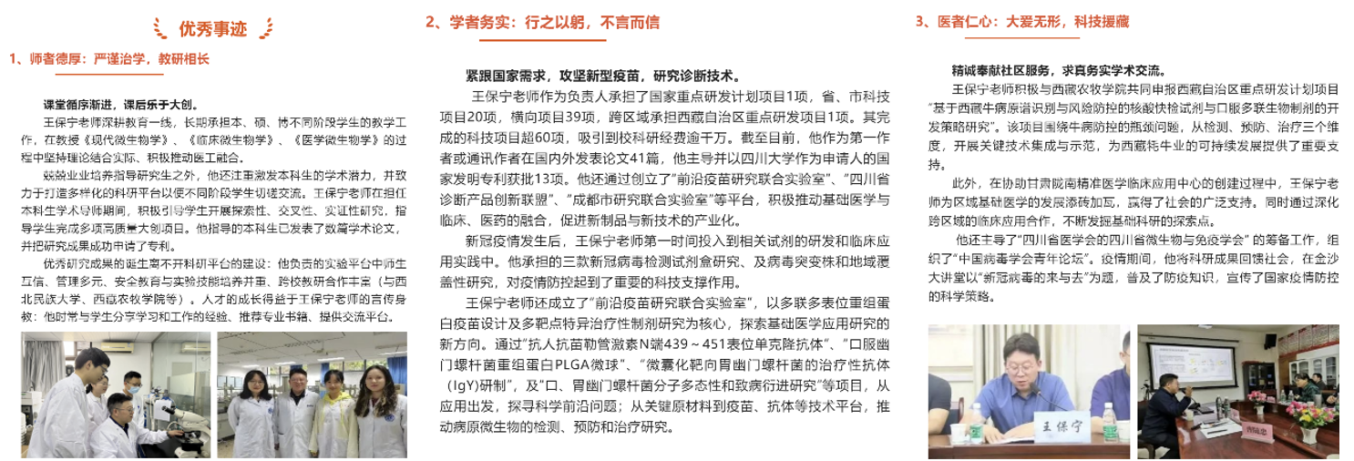 王保宁老师分别从“师者德厚:严谨治学,教研相长”,“学者务实:行之以躬,不言而信”,以及“医者仁心:大爱无形,科技援藏”跟支部党员老师们分享了他的工作经验和感悟。王保宁老师勤恳教书育人,课堂循序渐进,课后乐于大创;积极科技研发,紧跟国家需求,攻坚新型疫苗,研究诊断技术,开发“新冠”诊断试剂盒;同时还热心社会服务,精诚奉献社区服务,求真务实学术交流。他以大视野、大胸怀和大格局成就大事业,不仅在学校,更在社会层面让更多人了解到病原生物学的研究工作,值得我们每一位党员学习。