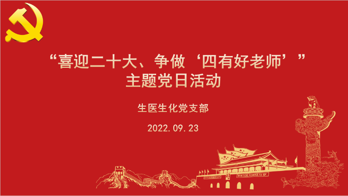 根据学院2022年师德建设宣传月活动方案,为规范师德行为,进一步抓好支部师德师风建设工作、促进教育教学事业的健康发展,生医生化党支部于2022年9月23日,在逸夫楼327会议室开展了“喜迎二十大,争做四有好老师”主题党日学习活动。