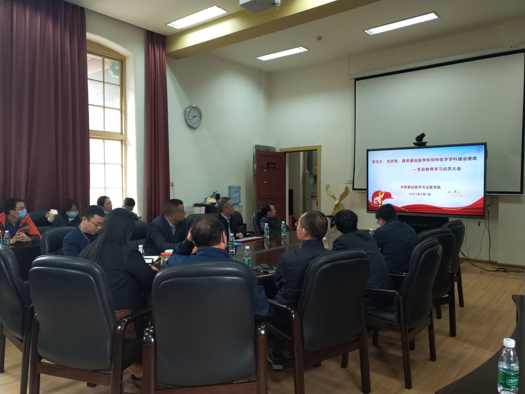 4月1日下午,学院在华西五教二会议室召开了党史学习教育动员大会,本次会议的主题是“学党史、悟思想、勇担基础医学和特种医学学科建设使命”。学院领导班子成员、党委委员、纪委委员、党支部书记、教研室主任参会。李昌龙书记作动员讲话李昌龙书记首先传达了中央和学校对党史学习教育的要求,他强调,要加强组织领导,领导干部、党支部书记要带头学习,党员不管处在哪个层次和岗位,都要全身心投入,做到学有所思、学有所悟、学...